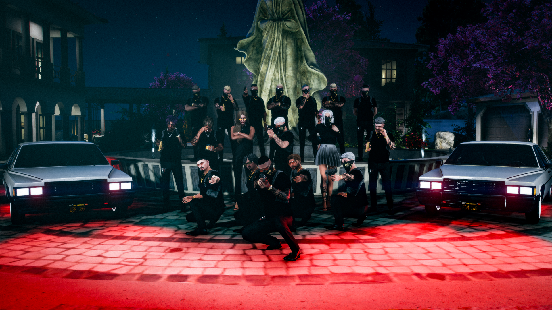 Das Anwesen ist heiliger Boden. Wer sich dort aufhält, tut das ausschließlich in Familienkleidung. Auf dem Gelände bewegen sich nur Familienfahrzeuge. Alles andere bleibt draußen. Am Haupteingang stehen jederzeit zwei Soldaten. Am Garteneingang stehen ebenfalls zwei Soldaten, ebenso am Hintereingang. Sie wachen über jede Ankunft fremder Familien maskiert, präsent, aufmerksam und gezogener Waffe. Das Anwesen steht für Respekt, Ordnung und Kontrolle. Wer es betritt, kennt die Regeln. Wer sie missachtet, zeigt, dass er nicht dazugehört. So schützt man Familie. So hält man Macht.